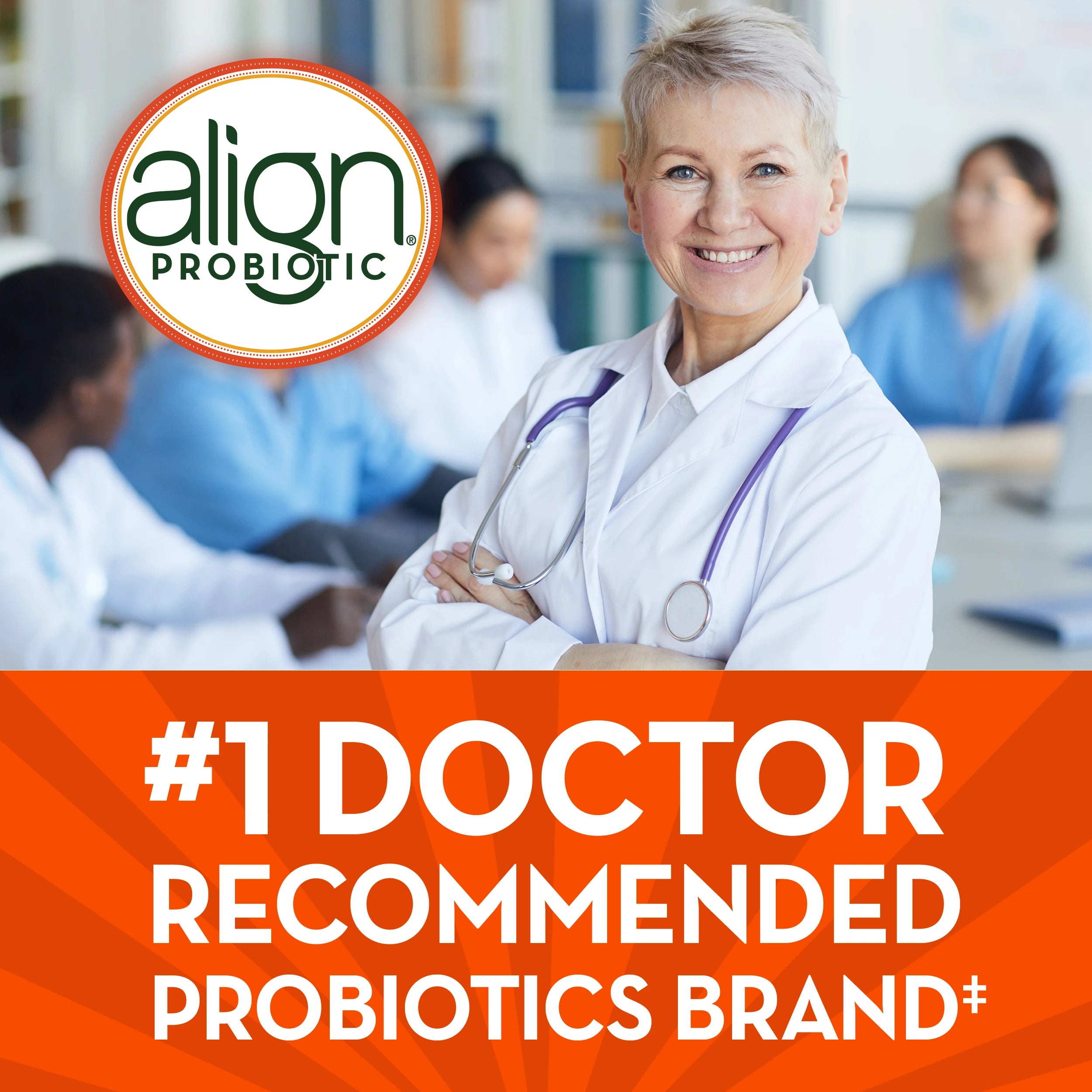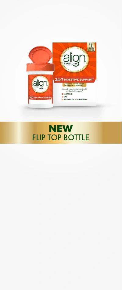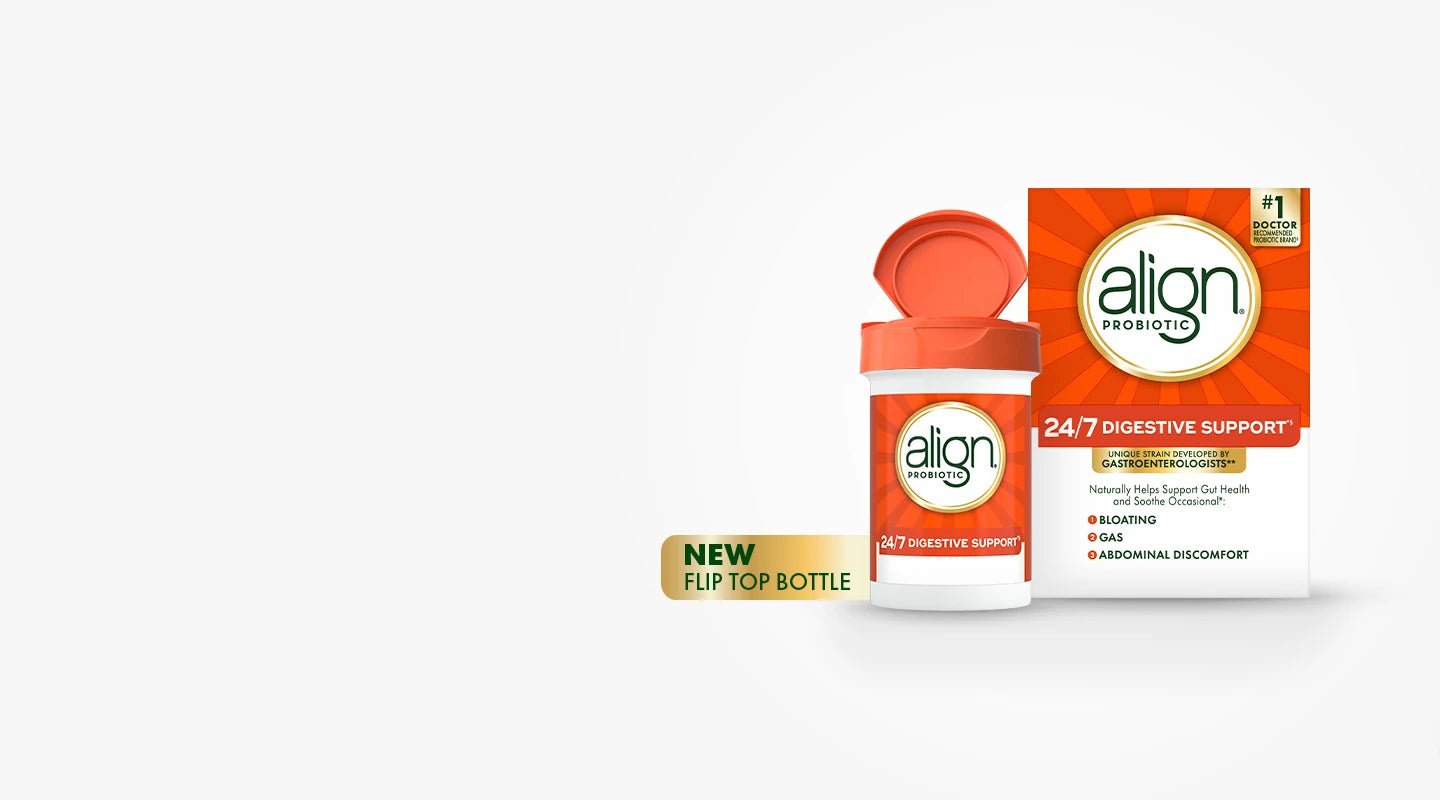 Align is a daily probiotic supplement that help fortify your digestive system with healthy bacteria 24/7*S. When taken daily, Align works by supplementing your digestive system with healthy bacteria to help maintain your digestive balance.* Align comes in three forms: capsules, Banana Strawberry Smoothie flavored chewable tablets for Adults, and Cherry Smoothie flavored chewable tablets for Kids 6+ years old.