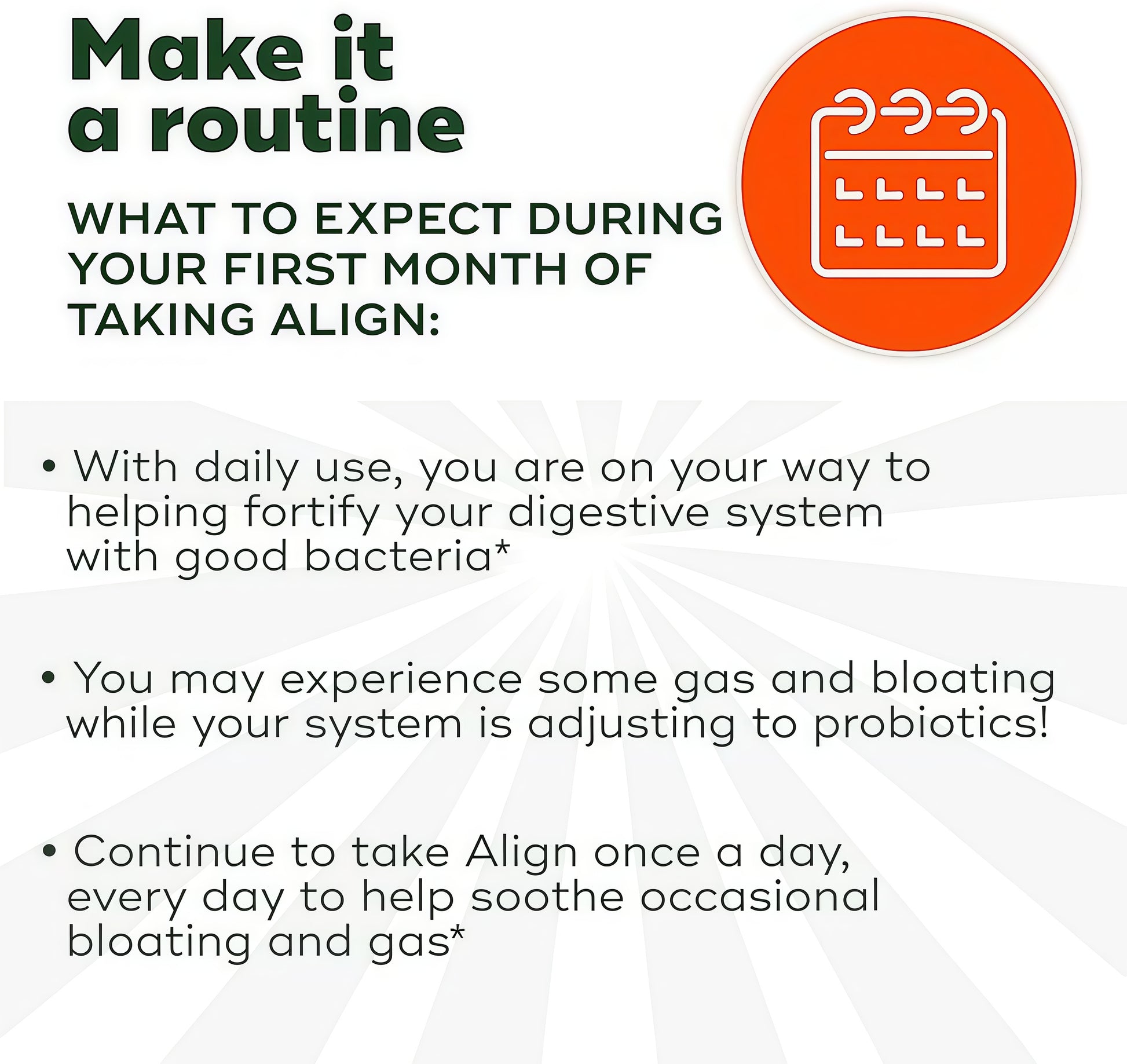Each person is different, as it depends on your guts' flora and the specific strain of the probiotic supplement. As in other probiotics, in the first few weeks of taking Align some consumers have reported experiencing some gas and bloating. This may be temporary while your system is adjusting to Align. But if you take Align once a day, each day, you can feel confident that you are promoting a healthy digestive system.